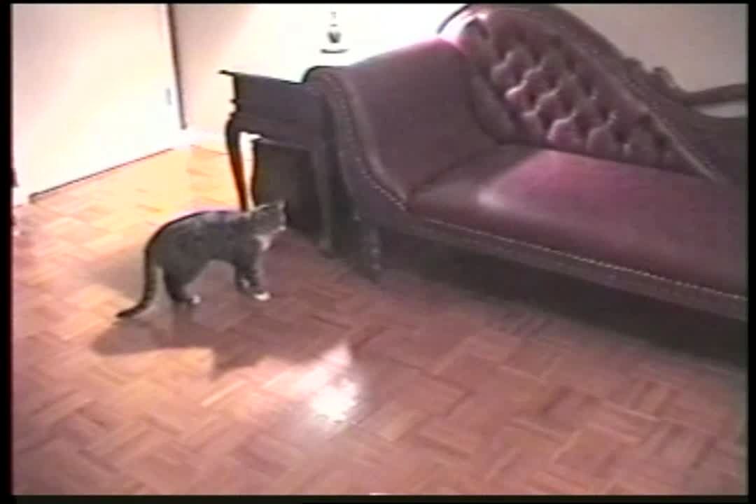 "Four-Legged Frenzy" Cat fights with Rat Terrier. Dog runs all over while cat sits in 1 spot waiting to scratch dog when it gets too close.