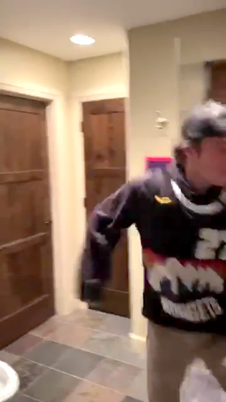 A young boy has virtual reality goggles on in the house. He punches the air. Then he accidentally punches a bottle on a bar cart. It falls and breaks spilling dark liquid all over the floor. Security footage.