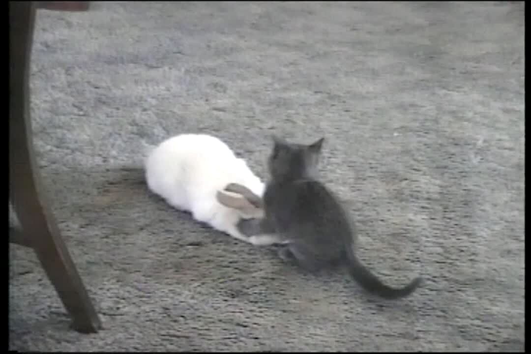Rodent: Bunny and kitten wrestle. Cat. Rabbit