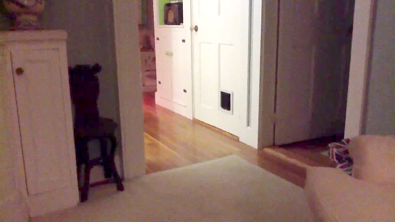 Small terrier dog waits outside doggy door until a cat jumps through the opening & tries to attack the dog.