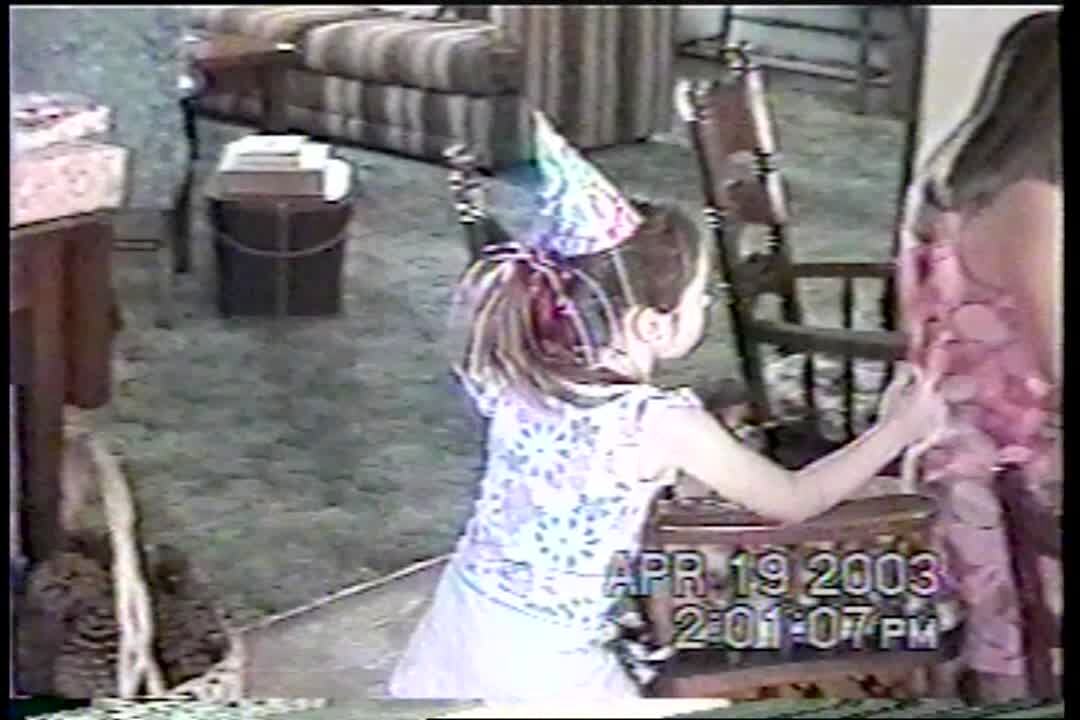 Girl at birthday party walks up to camera, jumps up & punches it, hits it into man's face. Man is surprised & angry.