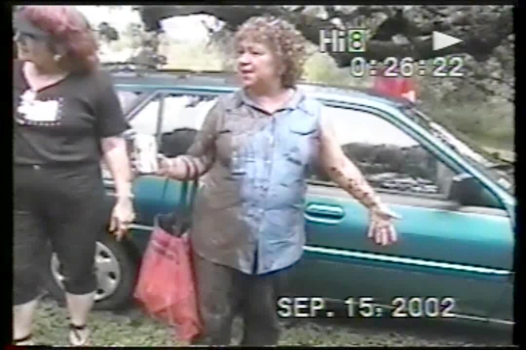 Deer named Daisy attacks heavy man by a dirt road. The man screams.