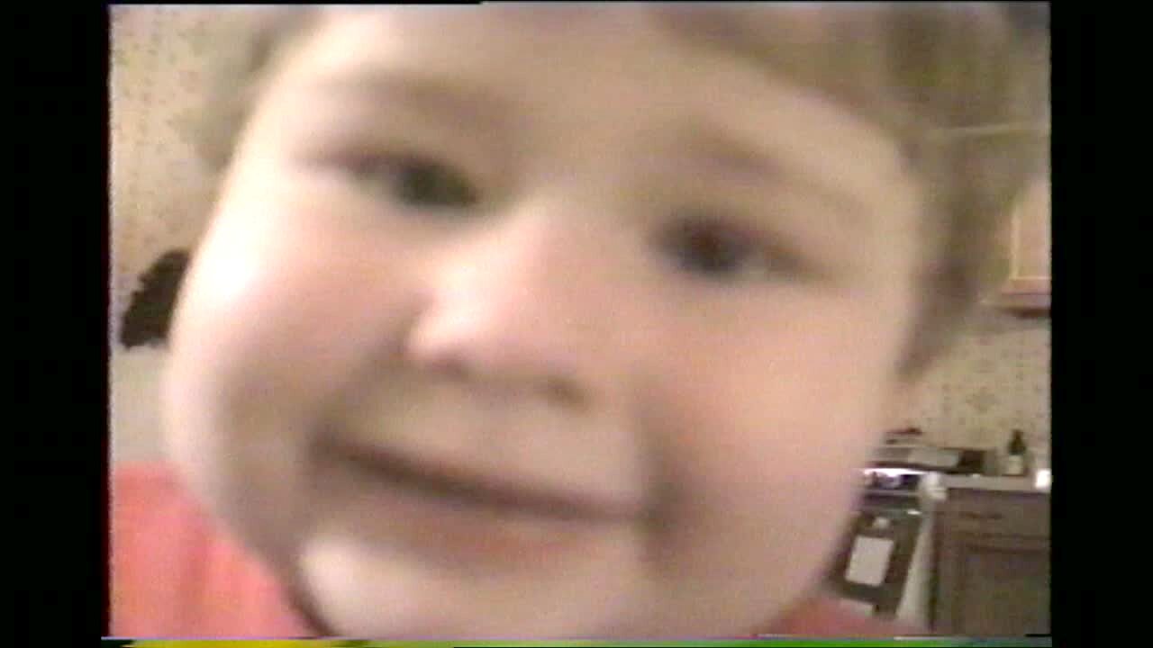 A woman plays with a baby girl and a tot girl steals the camera. The girl films herself as she laughs and runs through the house then falls.