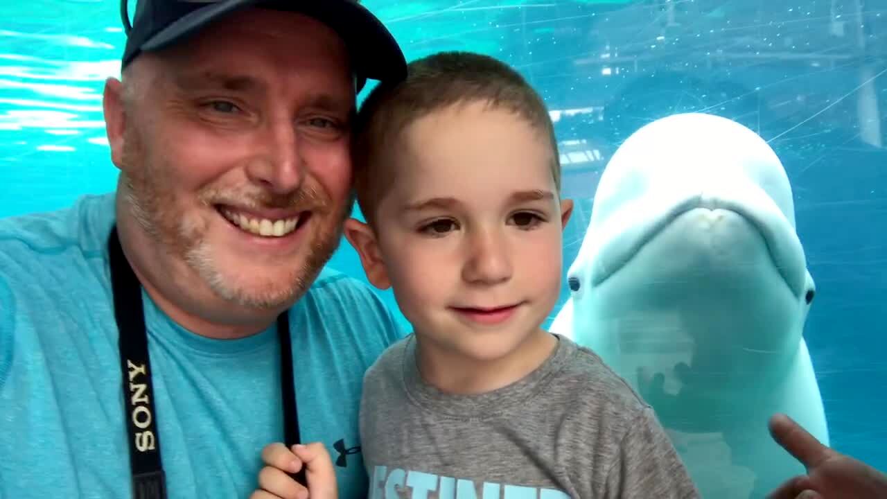 A man and young boy pose for the camera at an aquarium and the boy turns around to see a beluga whale over his shoulder. The whale opens its mouth and he gets scared.