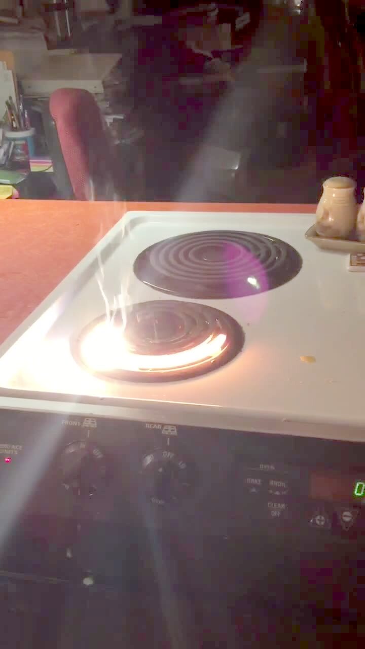 A woman calmly talks on the phone while her stove burner sparks electricity. She flees the kitchen and freaks out when it explodes and starts a fire.