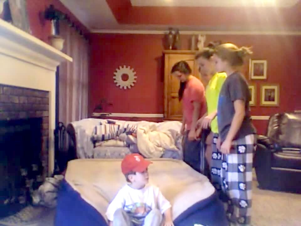 Four teenage girls jump on an air mattress at the same time and a little boy sitting on the end flies forward, hitting the camera. They all laugh.
