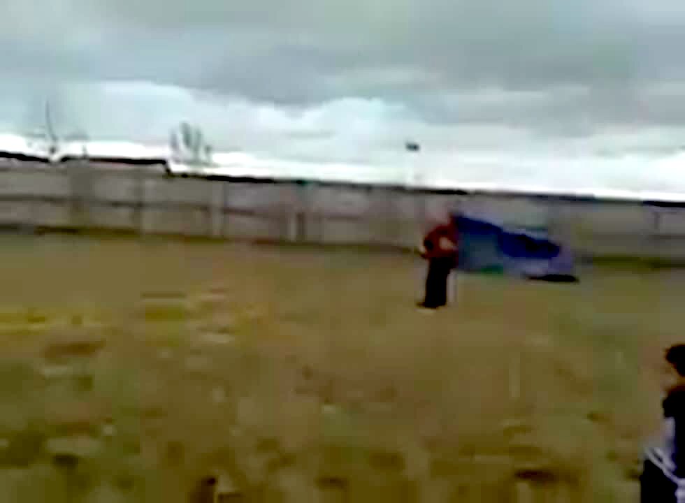 Boy flies over a fence in a wind storm by holding onto a large tent that's attached by rope to a kite. He is pulled way up in the air.