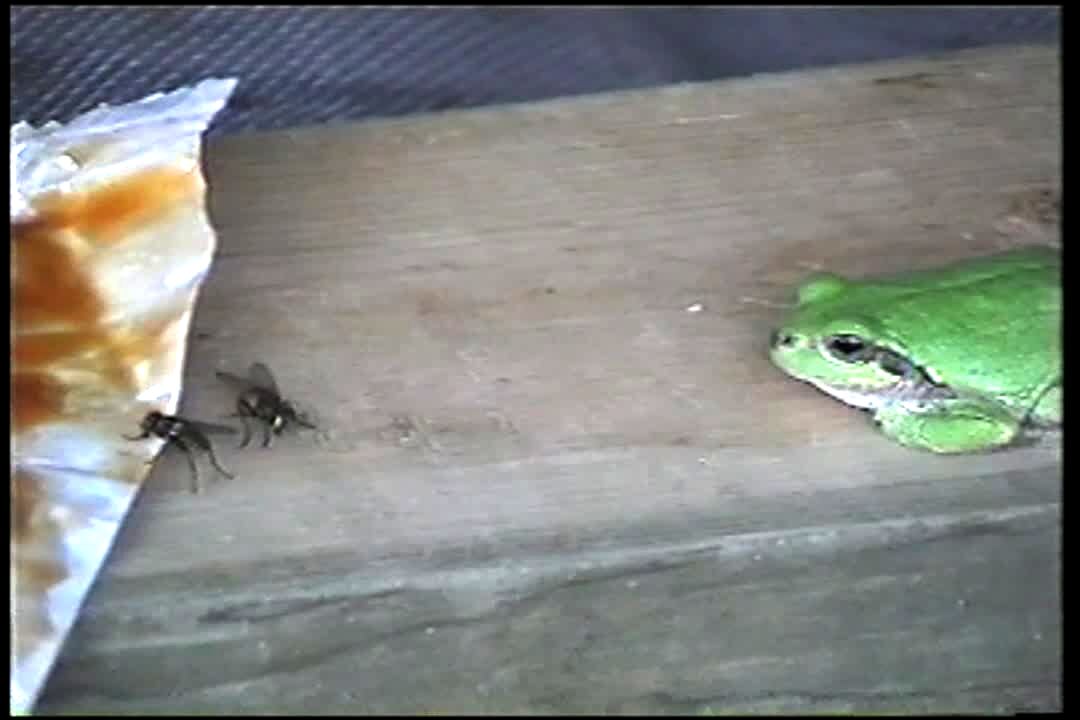 Frog watches 2 flies on a candy wrapper, then it jumps and eats them both in one bite. Attack.