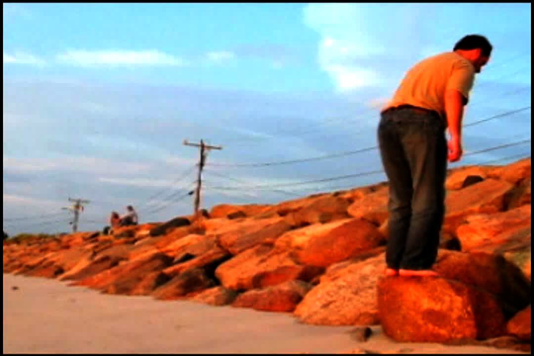 Bonehead man tries to do a backflip off of a rock and falls down. SHORT CLIP.
