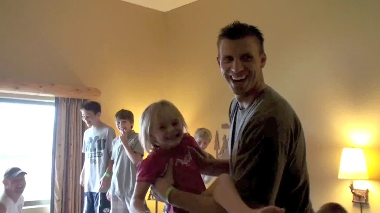 Dad launches 2 different little girls off an air mattress into another man's arms. Kids cheer. In the den, long for edit.