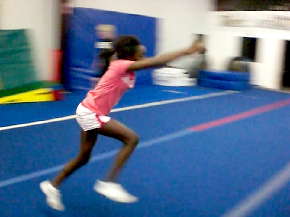 A young girl at a cheerleading competition does a few back handsprings in a row. A young boy runs onto the floor and almost runs into her but a woman pulls his shirt back right before they collide.