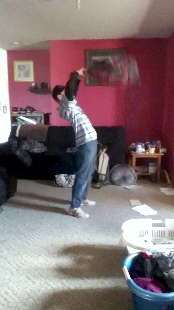Teen girl does a flip while hanging from an exercise bar that hangs between the door jambs. Second time she does it the bar releases and she falls.