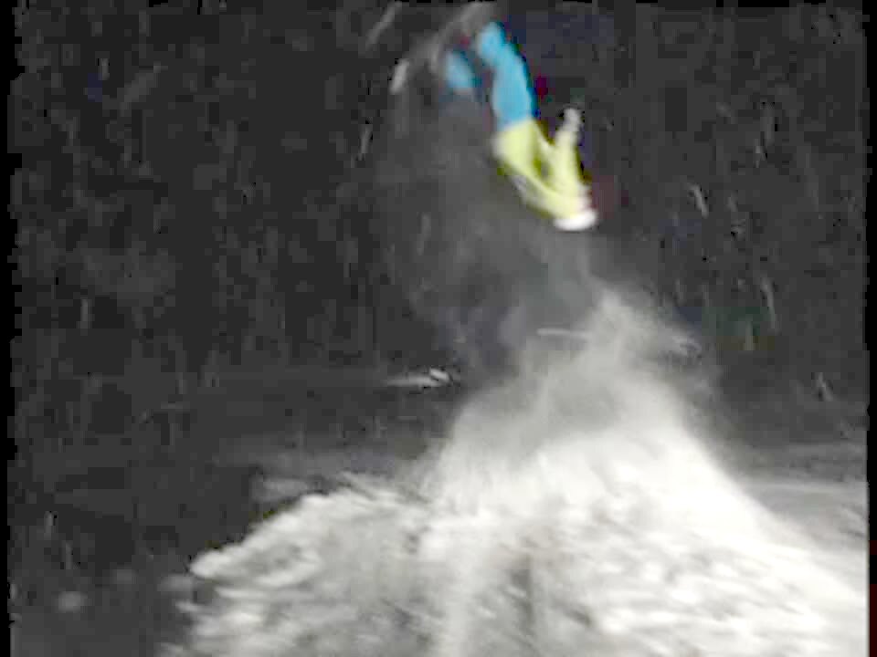 Man skis at night while being pulled behind a Jeep. He goes over a snow mound & flips in the air, lands on his back. No recovery.