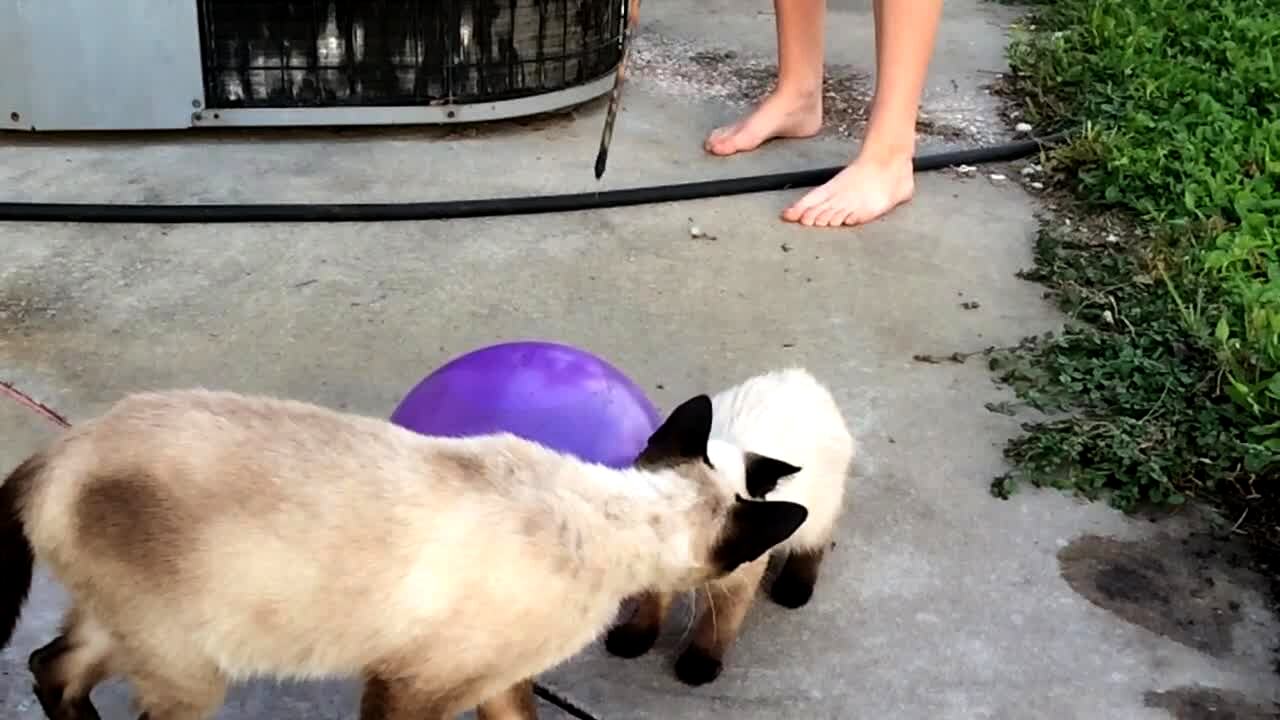A young girl pops a water balloon on her head in slow motion. AA: Water balloons in super slo-mo.
