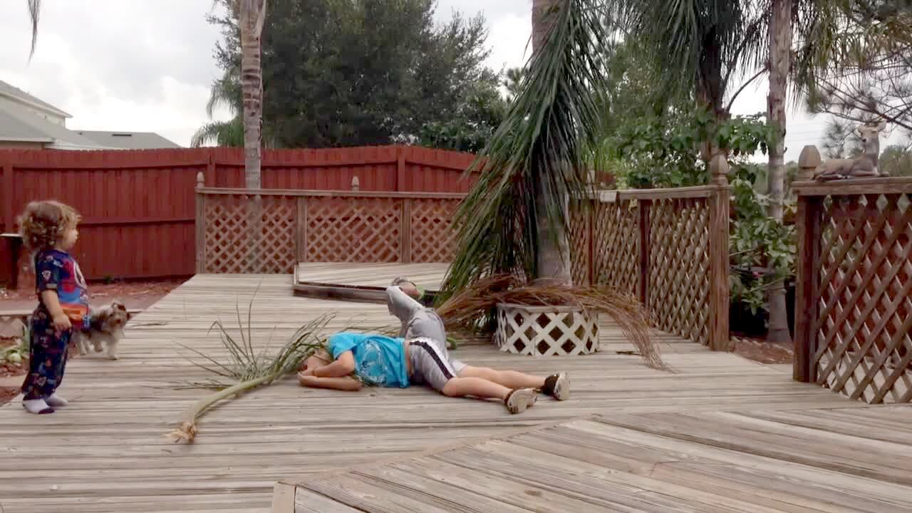 Two boys attempt to swing from a branch hanging from a palm tree outdoors and the branch falls, dropping them down onto a deck.