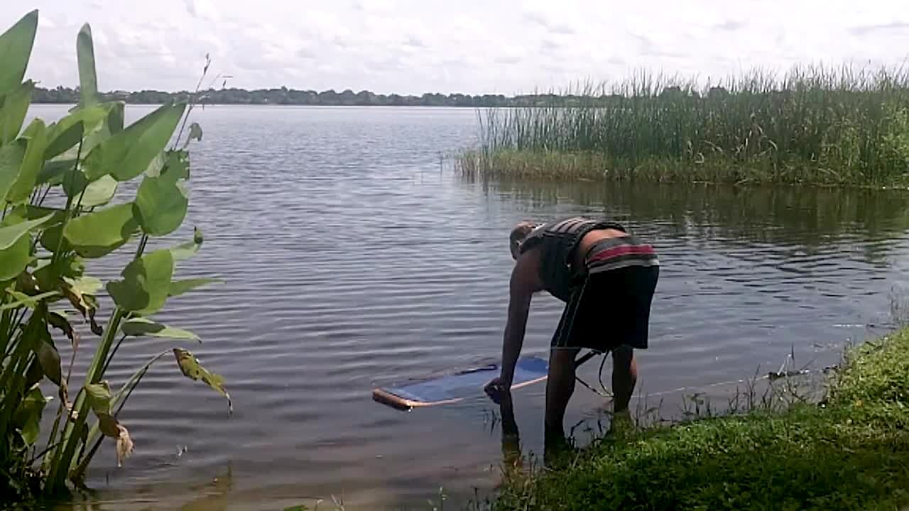 A man jumps on a wakeboard to "wakeskate" but falls forward.
