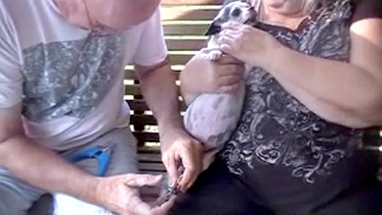 A dog is having its nails trimmed on a porch. He's not liking it very much. He makes a good noise.