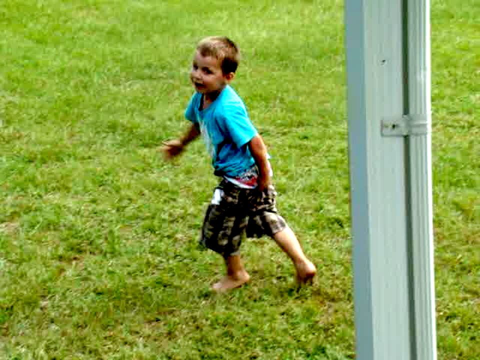 A boy drives around on a power wheels ATV, dragging another boy whose pants fall off. Action first :30.