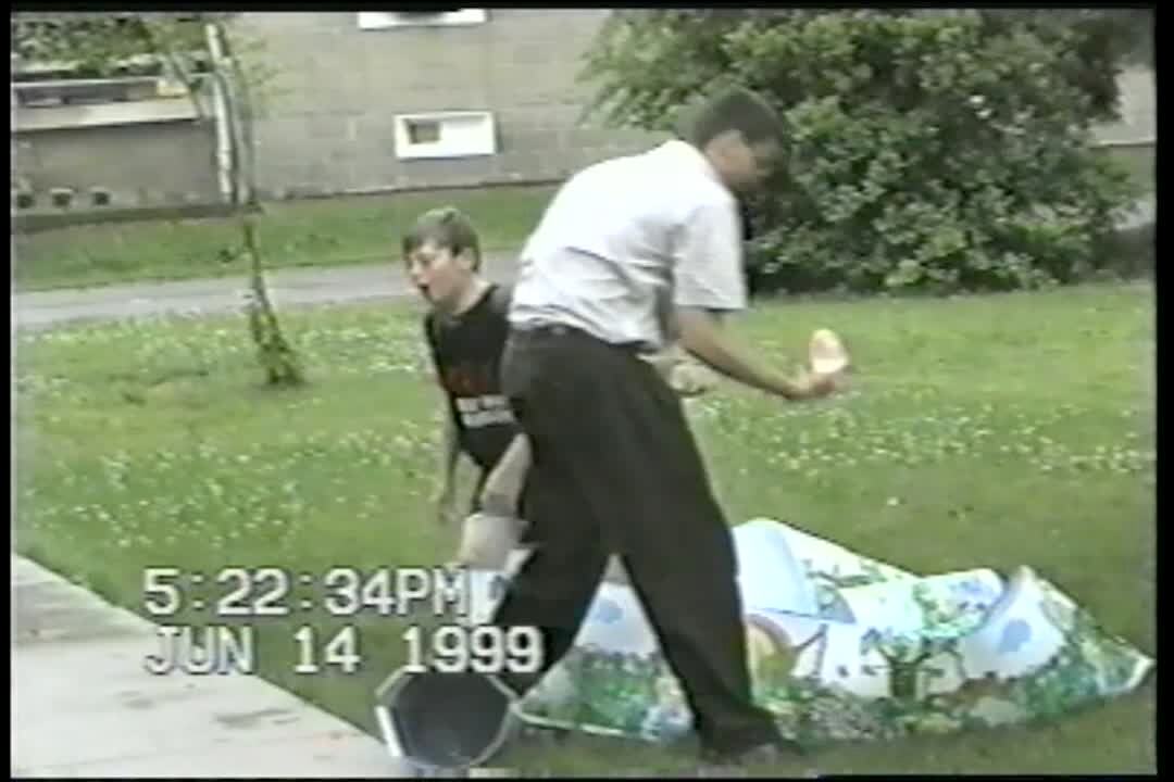 A young boy gets scared of a man in a T. Rex costume as he chases him around a front lawn.
