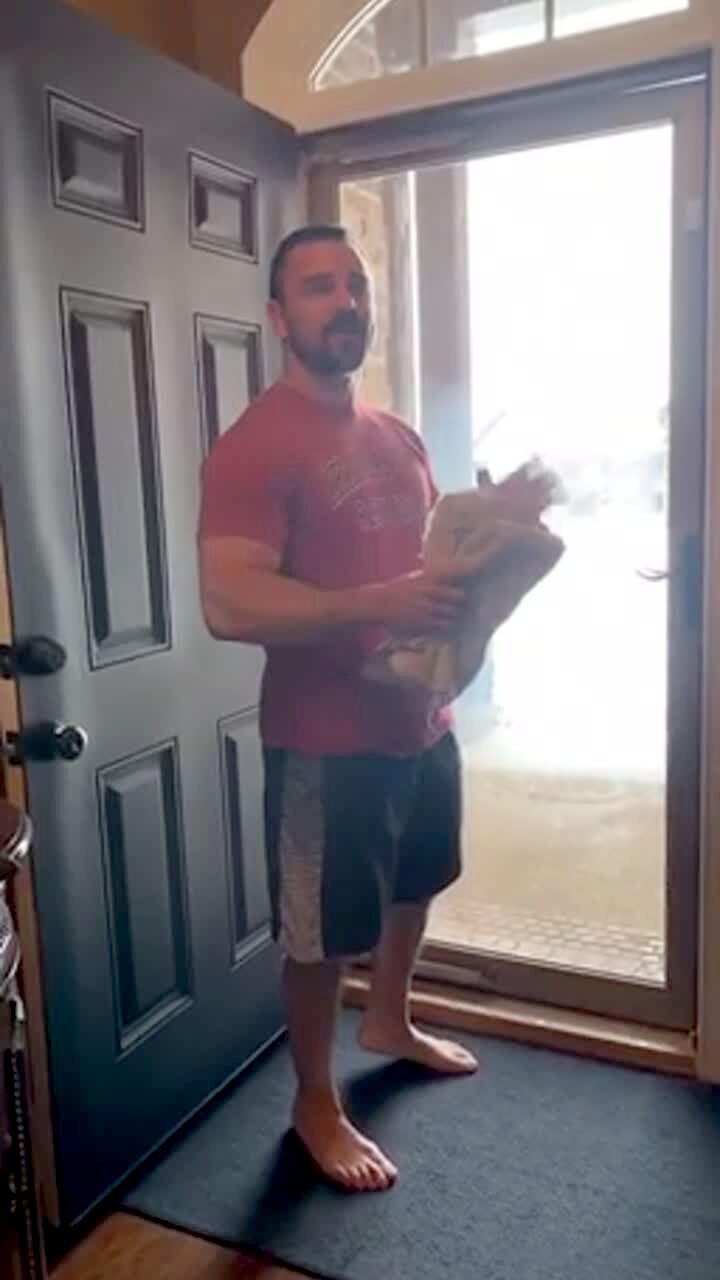 A man carries a cabinet outside and across a front lawn. The cabinet falls apart in his hands. Security Footage.