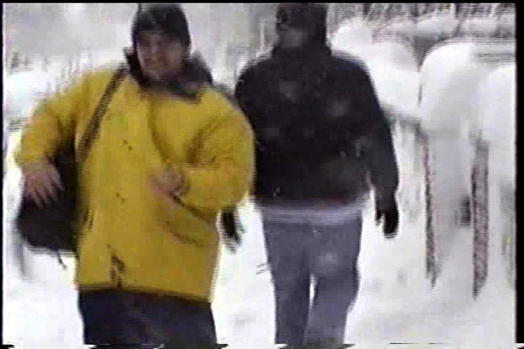 Two men throw snowballs at the camera woman on a snow covered sidewalk. One man hits the camera woman and the camera lense. Profanity.