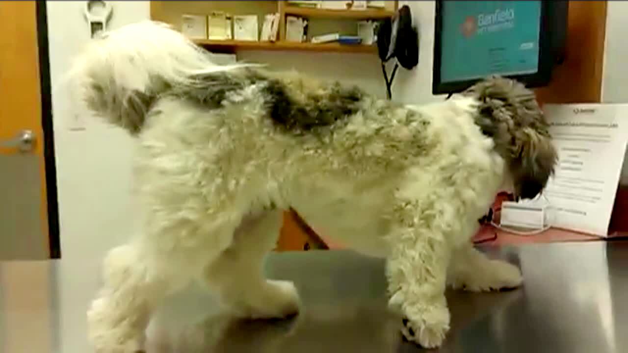 A dog stands on vet's table and doesn't move. He looks frozen in place.