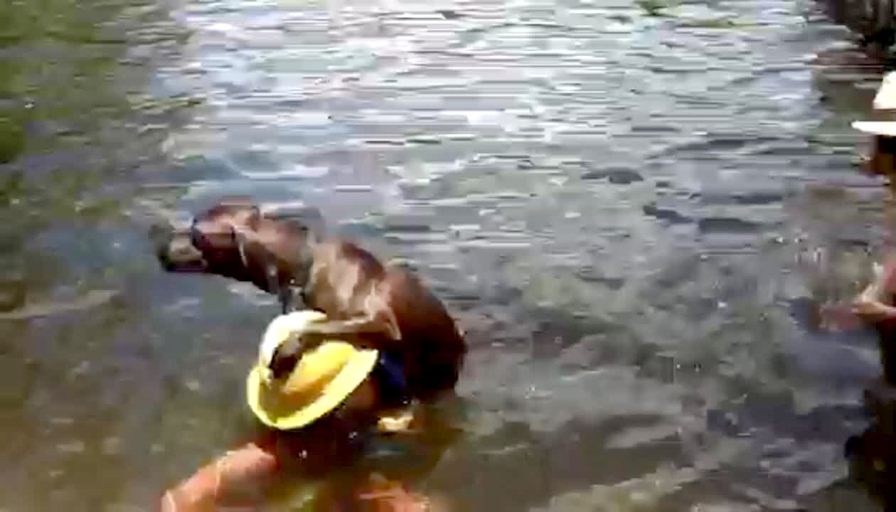 Dachshund dog swims in pool. Man lifts him out of the water by his life jacket. He drinks from hose and keeps swimming / paddling in the air