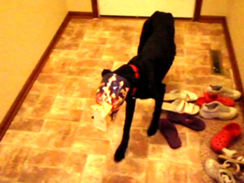 Dog has popcorn bag stuck on its head. It expands and contracts when the dog breathes.