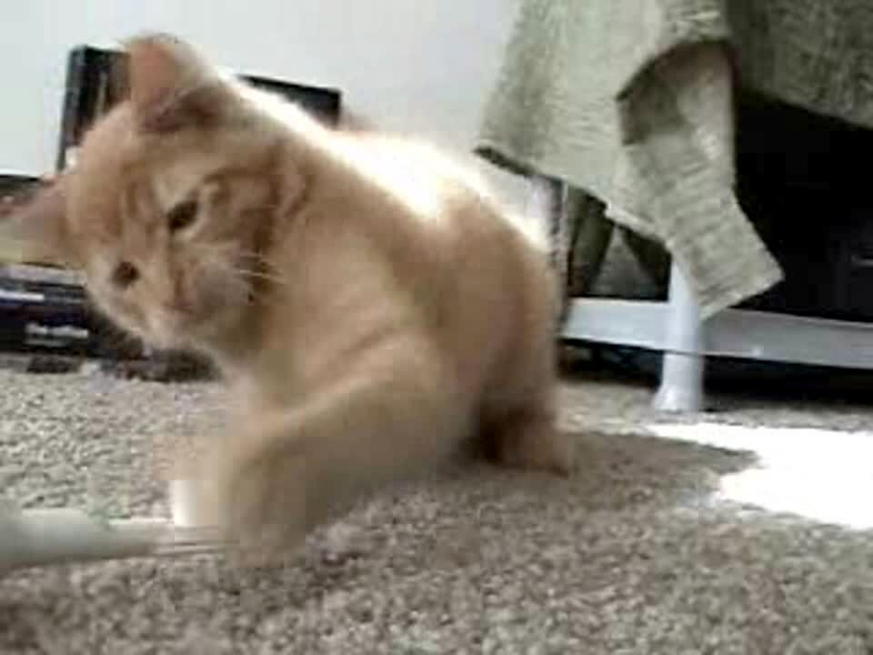 Orange kitten hides in a laundry basket. Man throws clothes at the basket & each time the cat jumps up, does a flip, tries to attack the clothes.