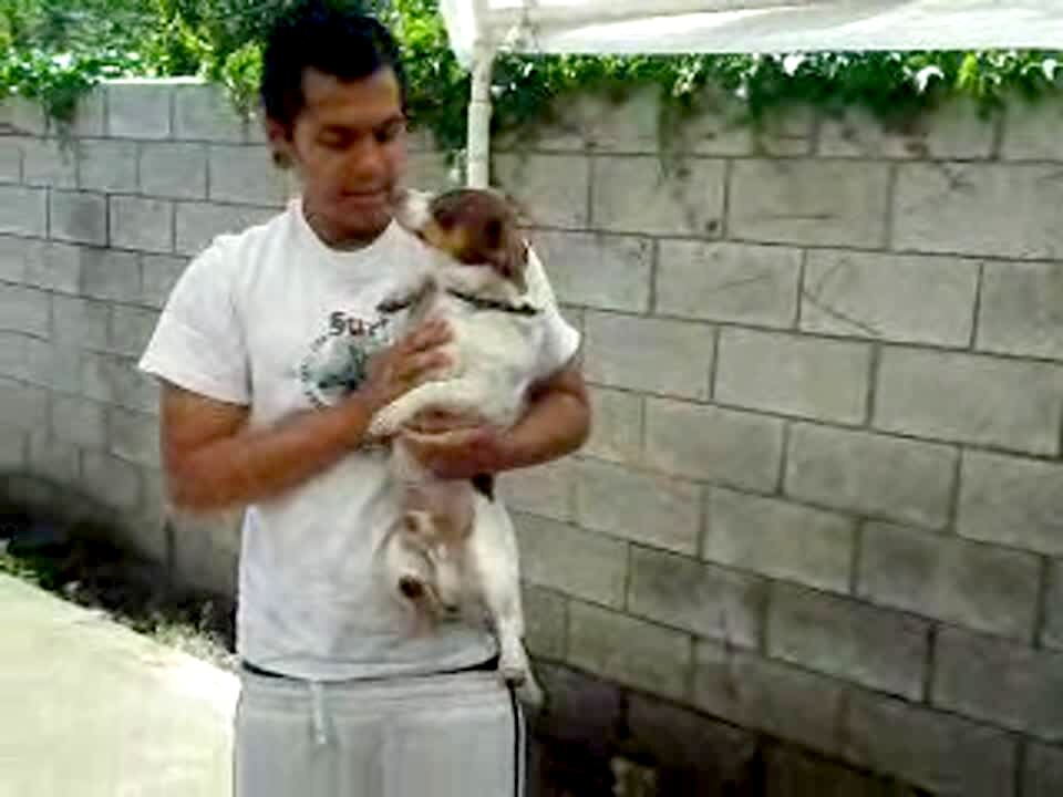 "Loose On Linoleum" Jack Russell dog runs to chase a boy through the house. Dog is put down on the tile floor and runs in place for a moment.