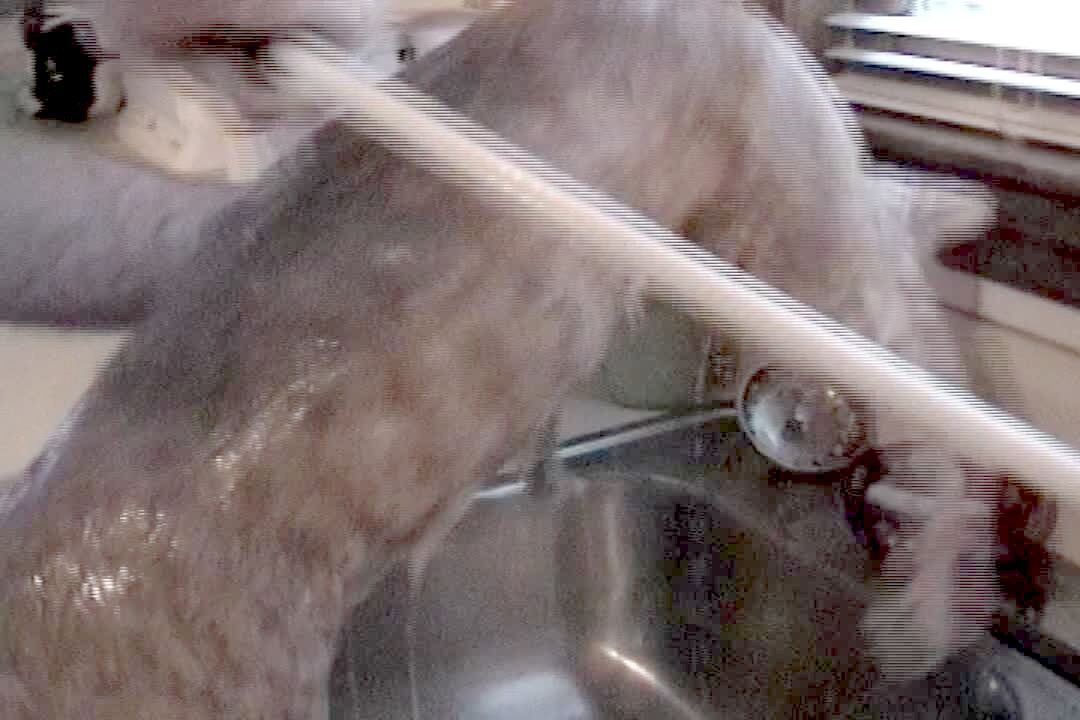 "Clinging Kitty" Cat gets a bath in the kitchen sink & holds on to window blinds because it doesn't want to go back in the water. Cat won't let go. Clip is edited heavily & has many dissolves.