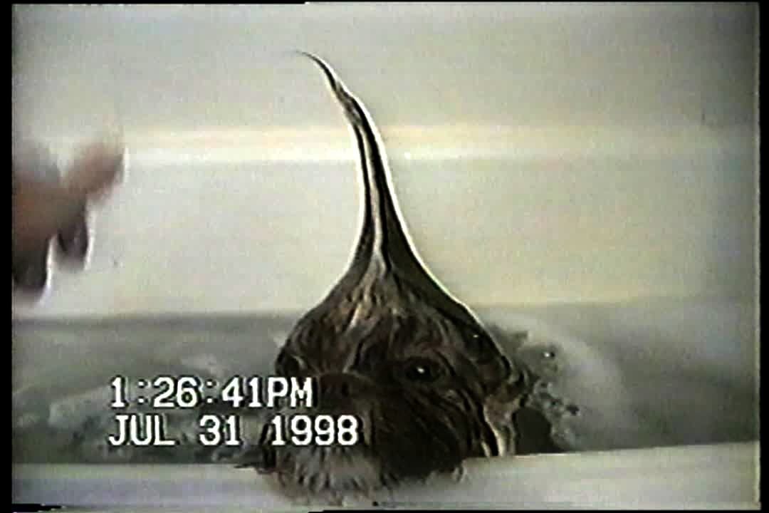 little dog taking a bath; ears and hair are spiked. Cute visual