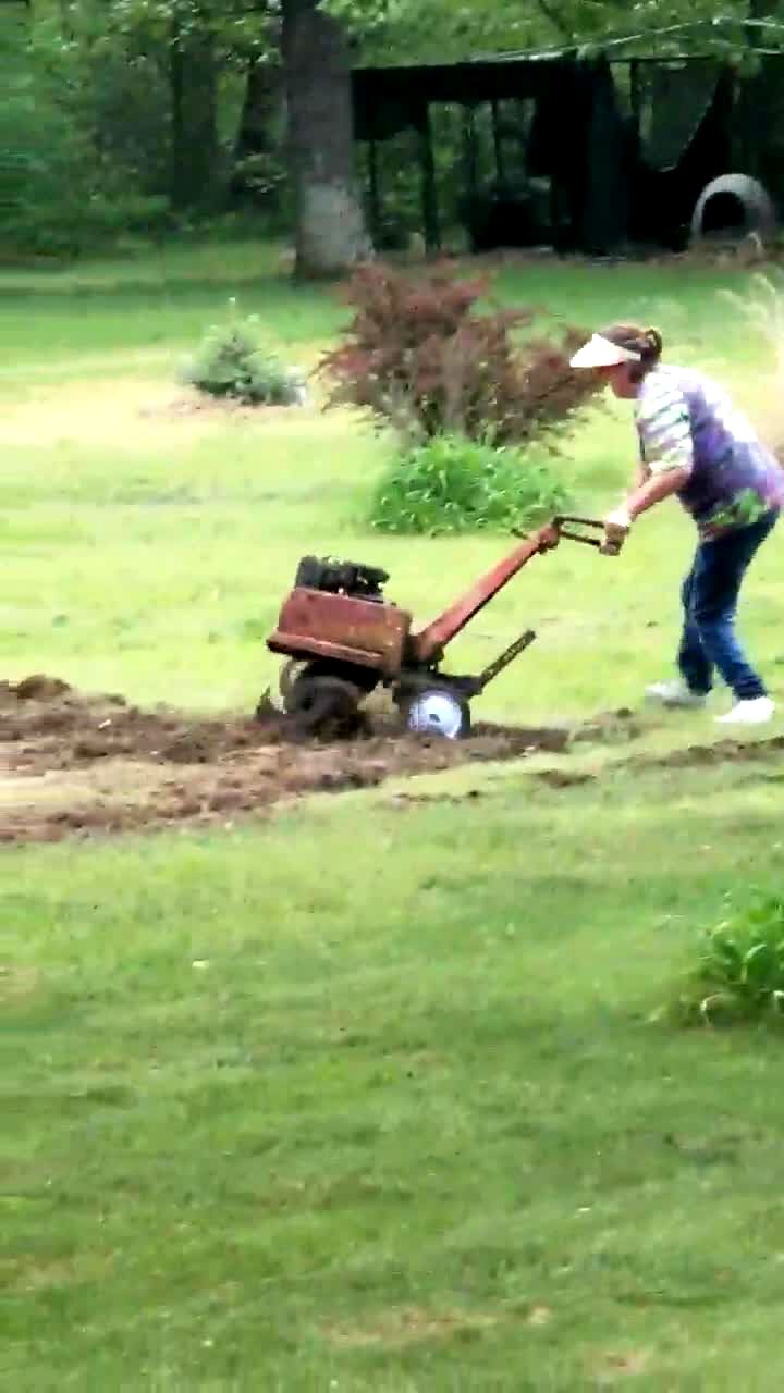 A senior woman's pants fall down while she uses a rototiller in her backyard.