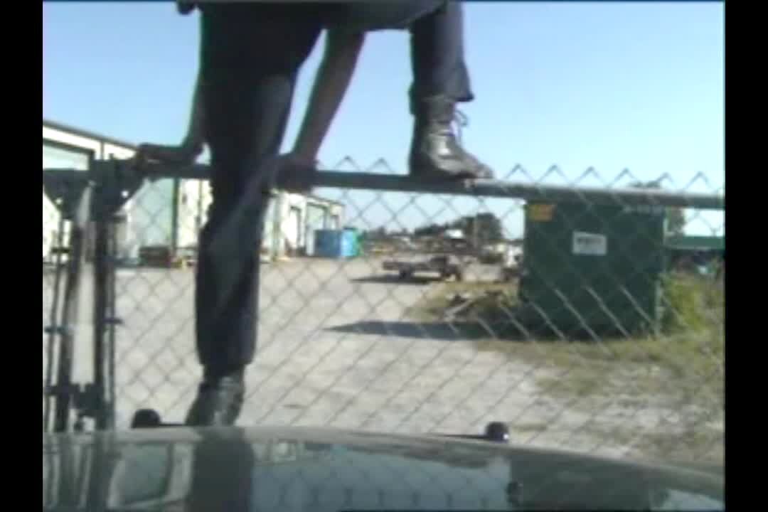 A police officer falls trying to get over a fence in front of his cop car camera.
