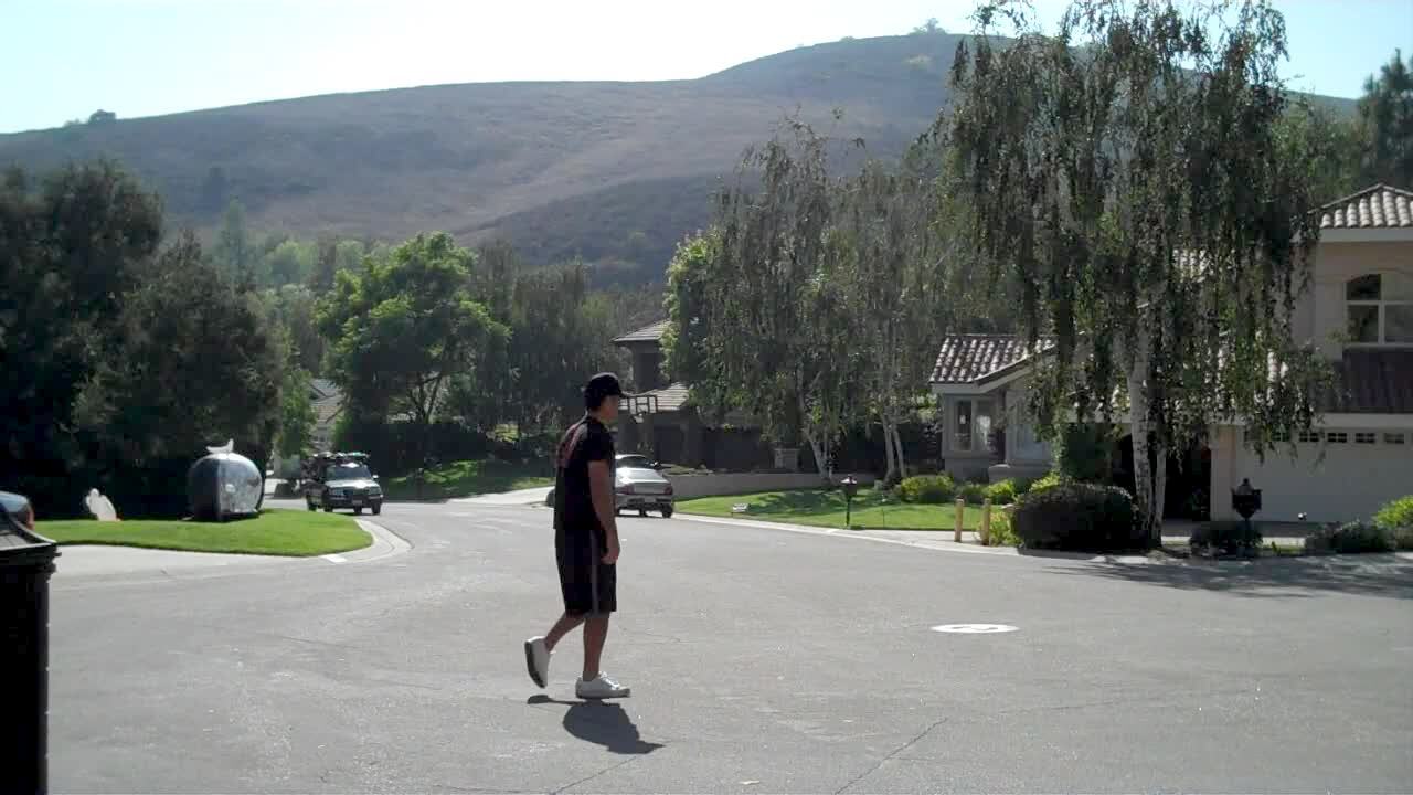 Dad throws football in neighborhood street as boy in a go cart knocks him down. Shot from a distance on a tripod. Music over clip.