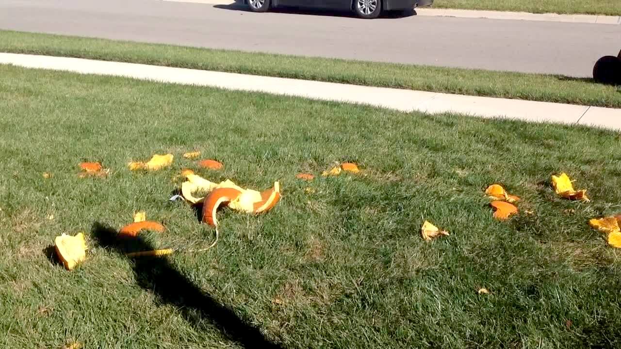 A boy runs over a pumpkin Jack-o-lantern with a go-cart repeatedly outdoors.