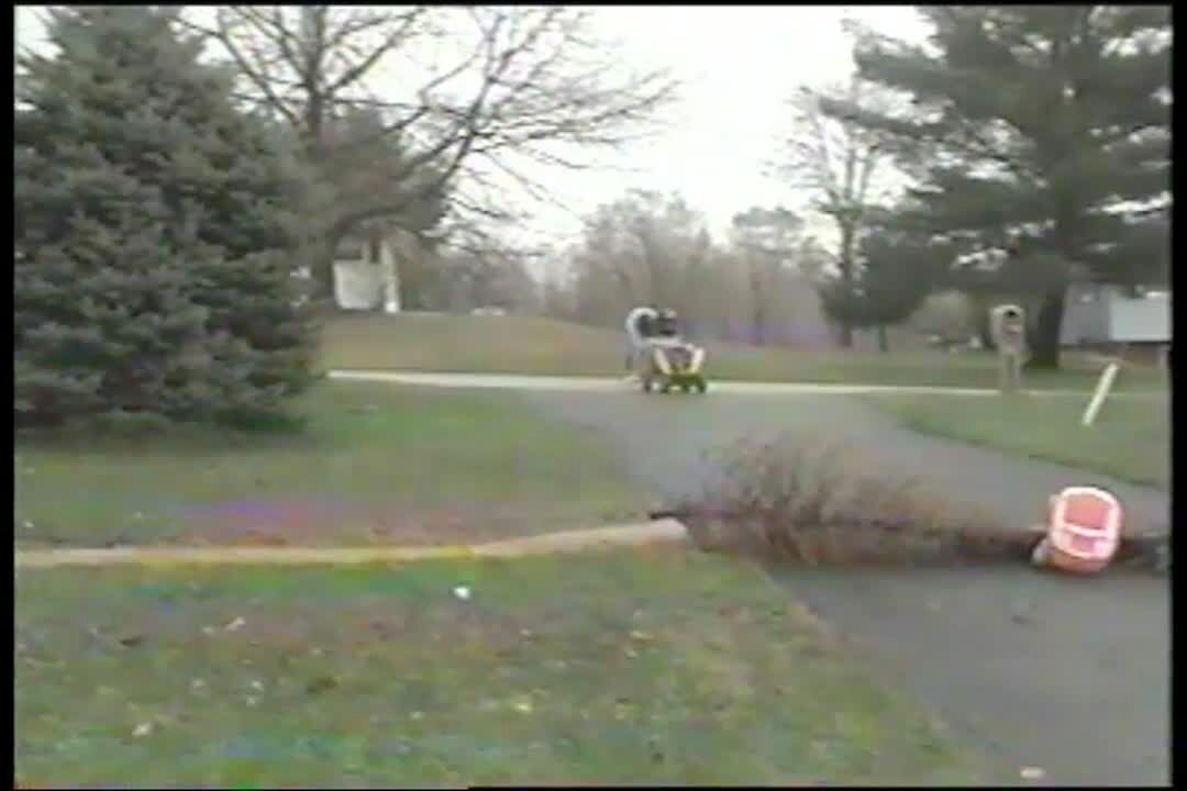 Teen boy rides go cart over tree branch, crashes into back of trailer, hits groin against plastic bag stuffed as a cushion. Set up. Driveway. Stunt. Crotch.