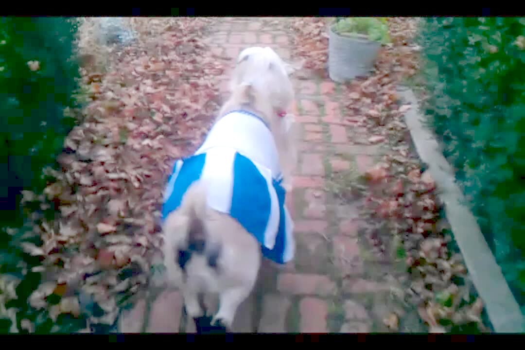 A goat walks around in a Cheerleader Halloween costume. A dog starts to follow and then runs away.