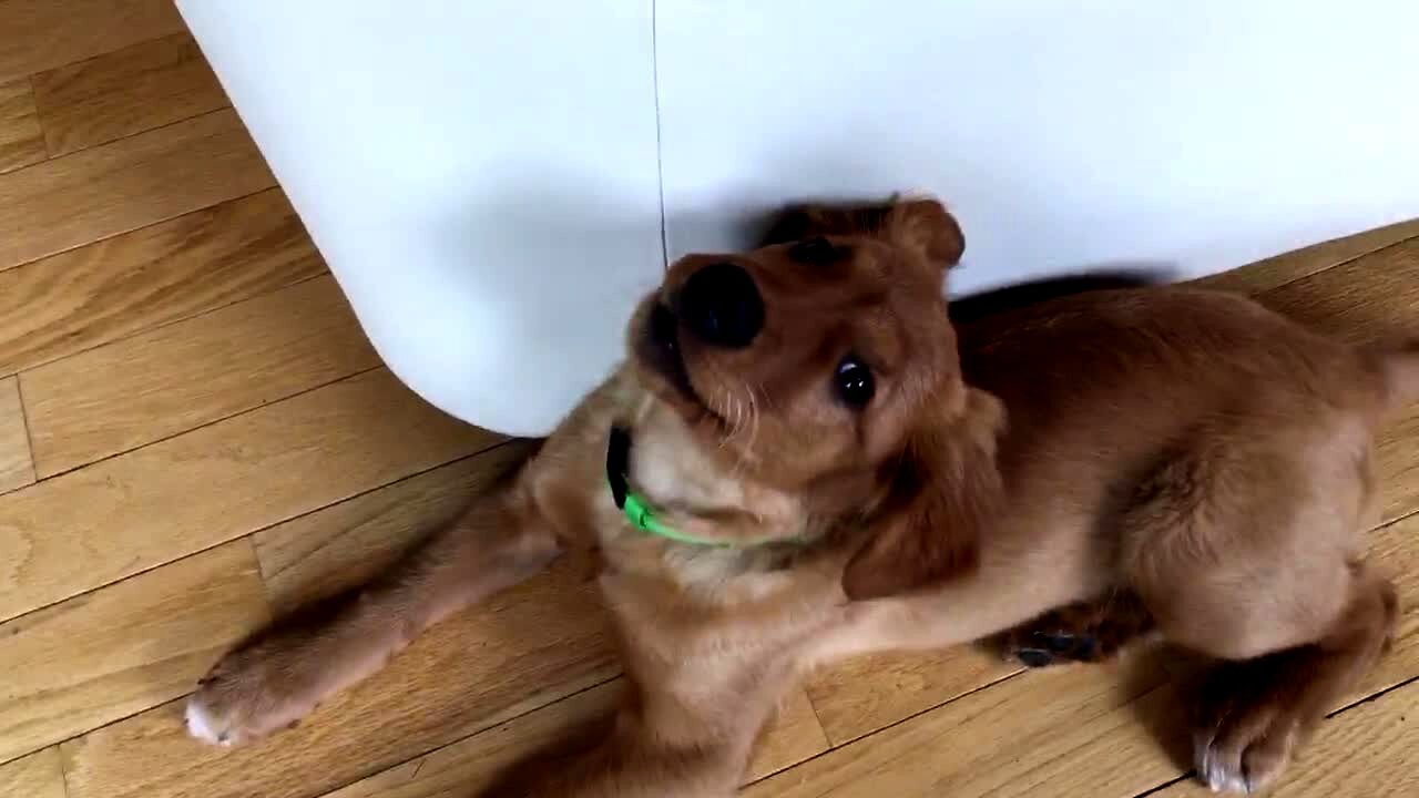 A Golden Retriever puppy dog struggles to get out of an open cage to play with other Golden Retriever puppies.