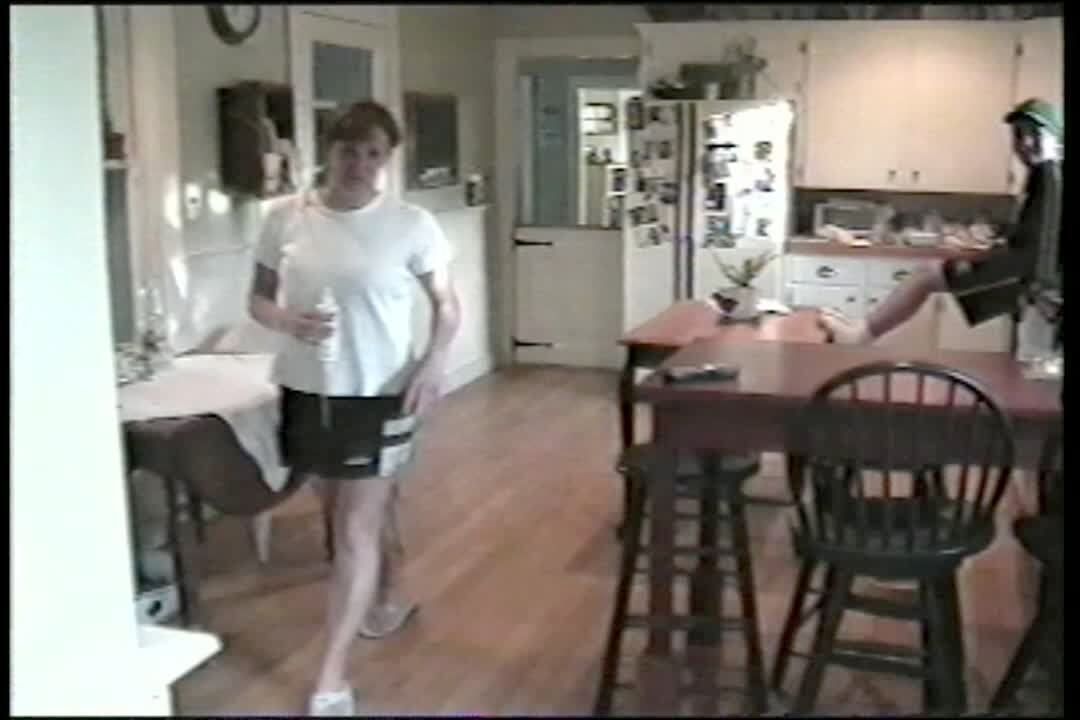 A dog rips up pieces of paper in the backyard and a young boy screams, and then a young girl runs out and screams "no, my homework" and freaks out. Security footage.