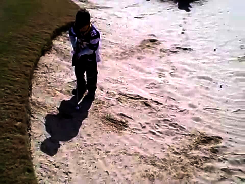 A young boy hits a golf ball, it bounces off a lake and a retaining wall around it, then flies through the air and lands back in front of him at a golf course.