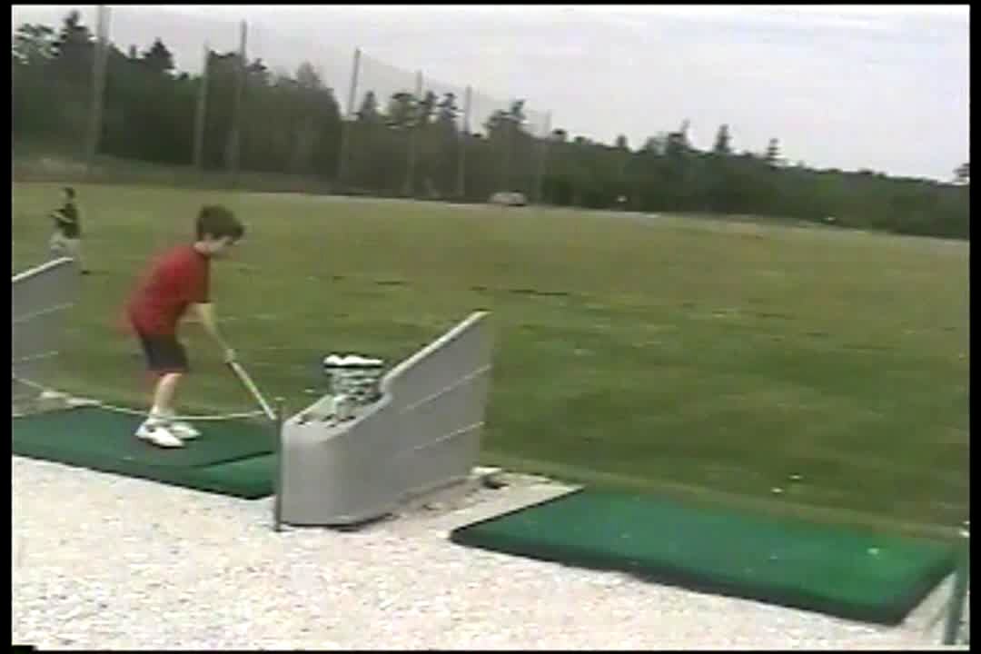 A teen boy's golf ball comes back to hit him after a swing at the golf course.