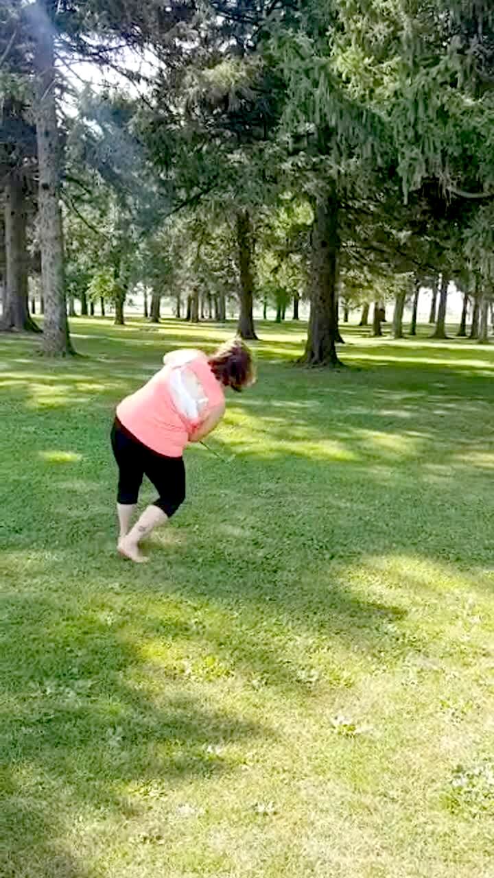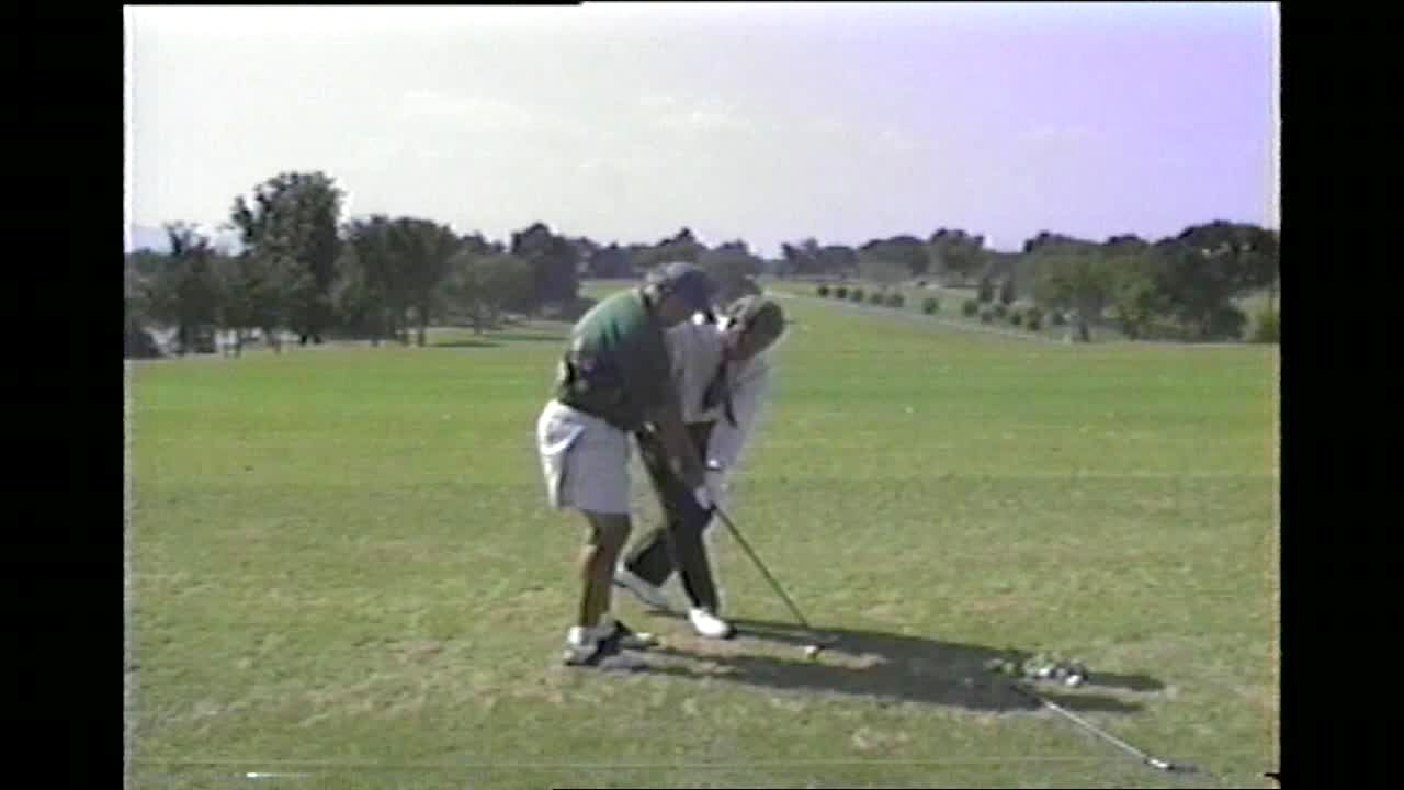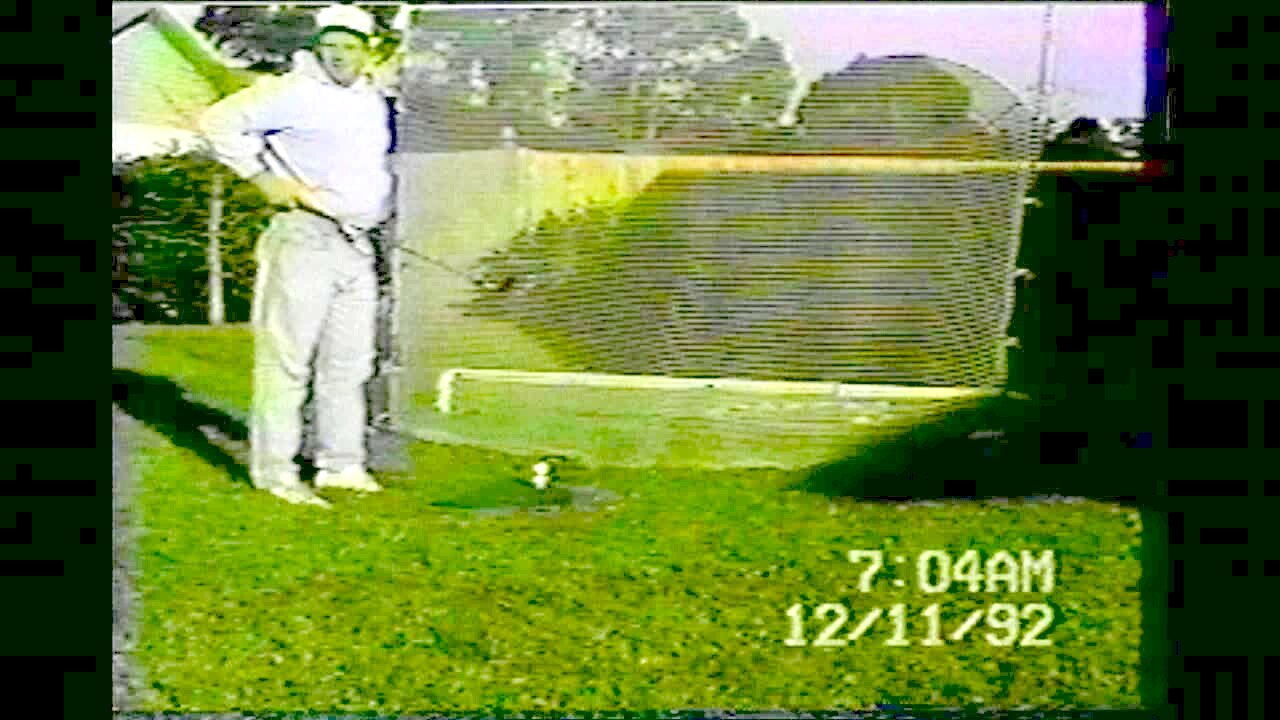golf - backyard golfer chips shot up and into his hat. Date on screen 1992.