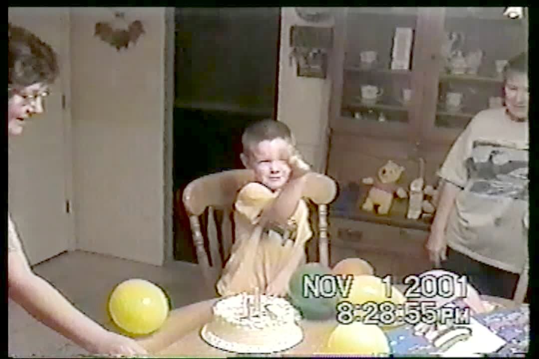 Grandma / senior woman pokes kid in eye with noisemaker at birthday party, he falls off chair.