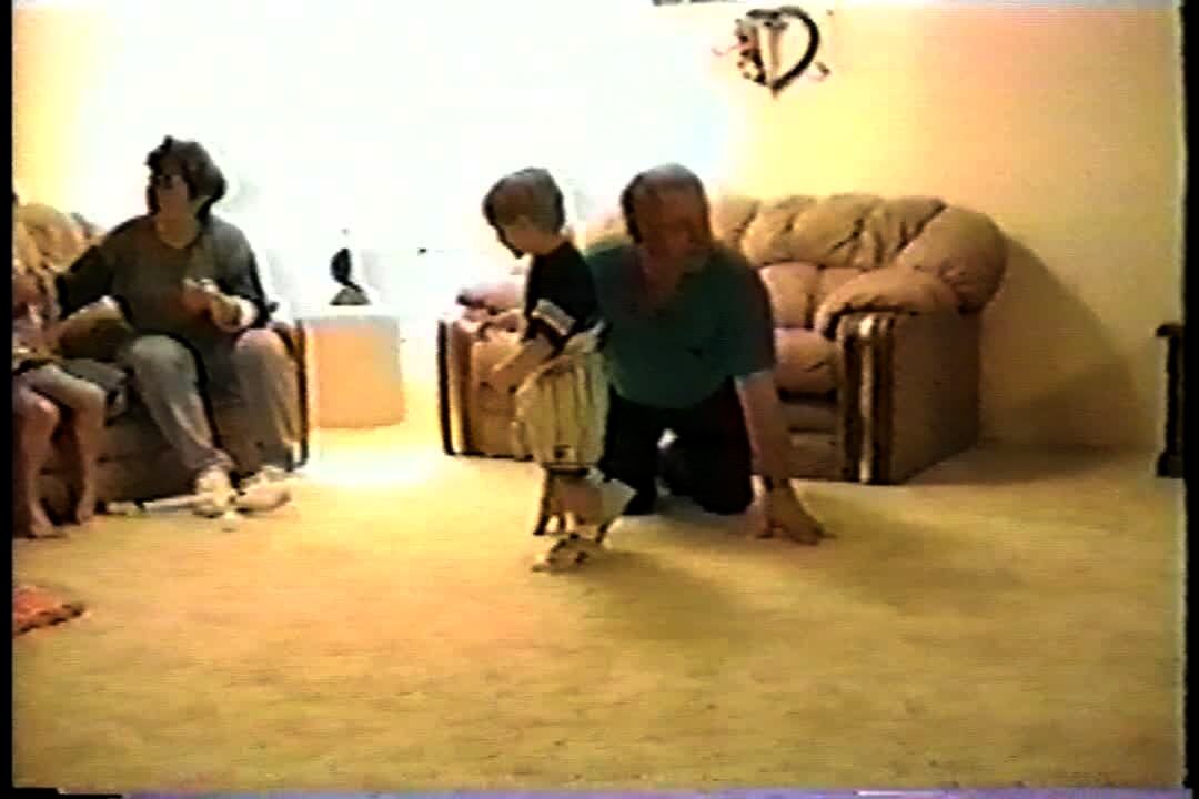 Boy playing with toy golf club in living room swings and hits kneeling grandpa / senior man right in the shin.