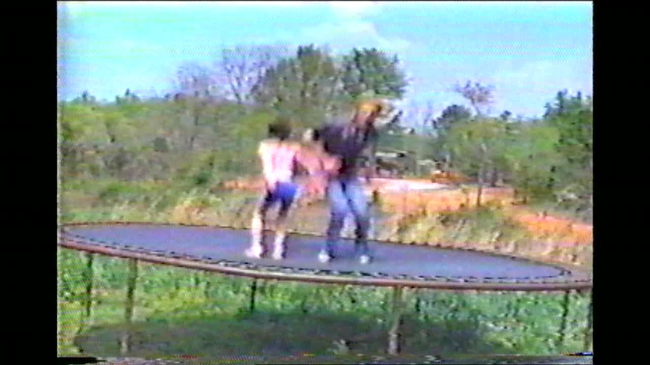 During rain storm, water builds up under patch of grass making the grass appear to be a giant water bed. Kids jump on it.