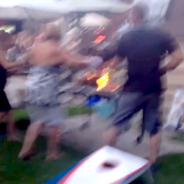 A barbecue explodes in the yard when a man and a woman try to smoke a turkey. Slow-motion.