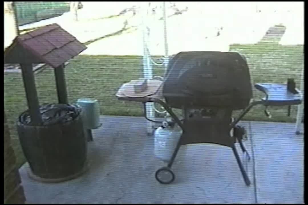 A man tries to pull a propane grill off the back porch of a home, but trips and falls into the back yard. Security footage.