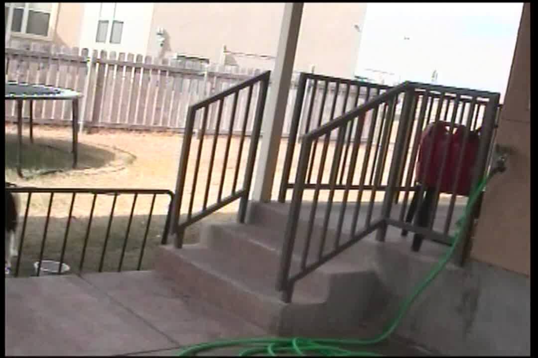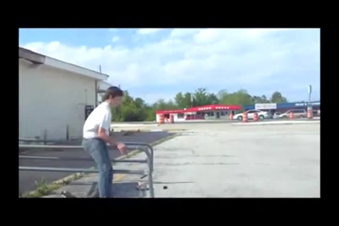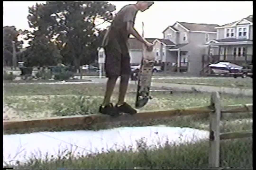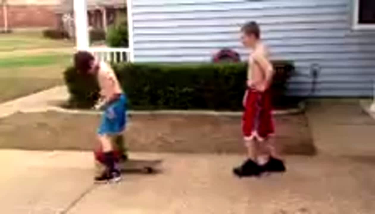 Big brother does a skateboard trick off a split rail fence. Little brother attempts the same trick hits his crotch on the board. No recovery