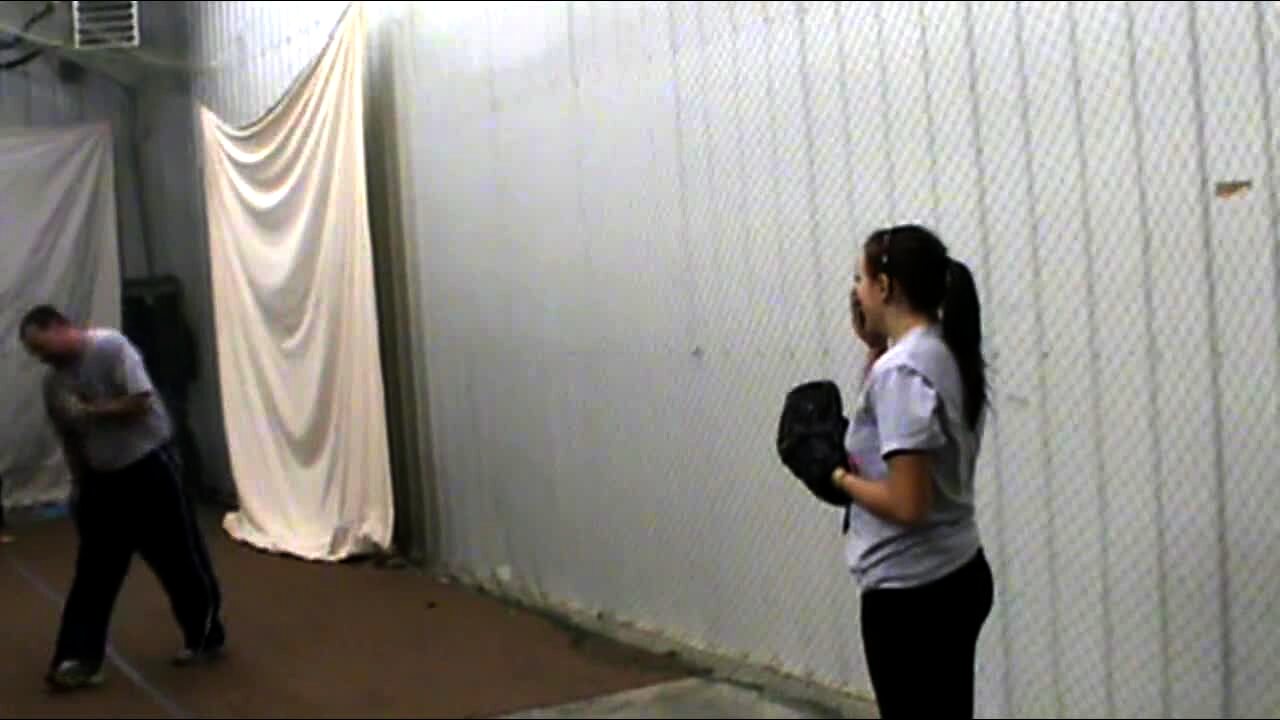 While practicing softball indoors, a teen girl tells her coach man to stand on the other side of the room so she doesn't hit him. She pitches and still hits the man right in the crotch.